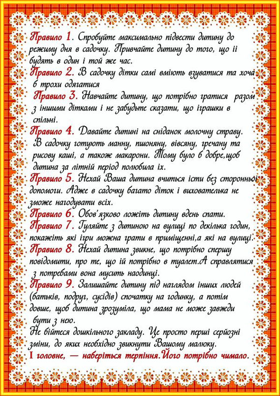 * Проводжайте дитину до групи та передавайте особисто в руки педагогам.