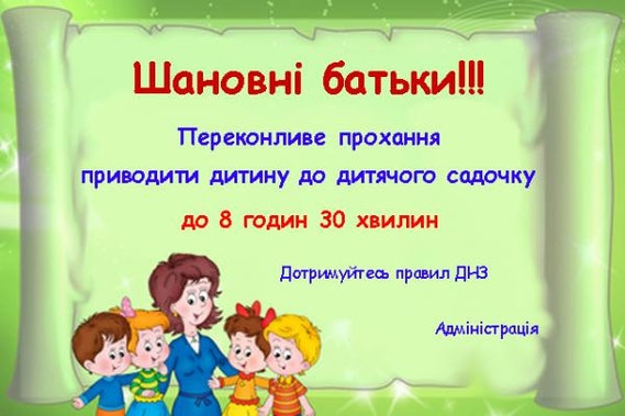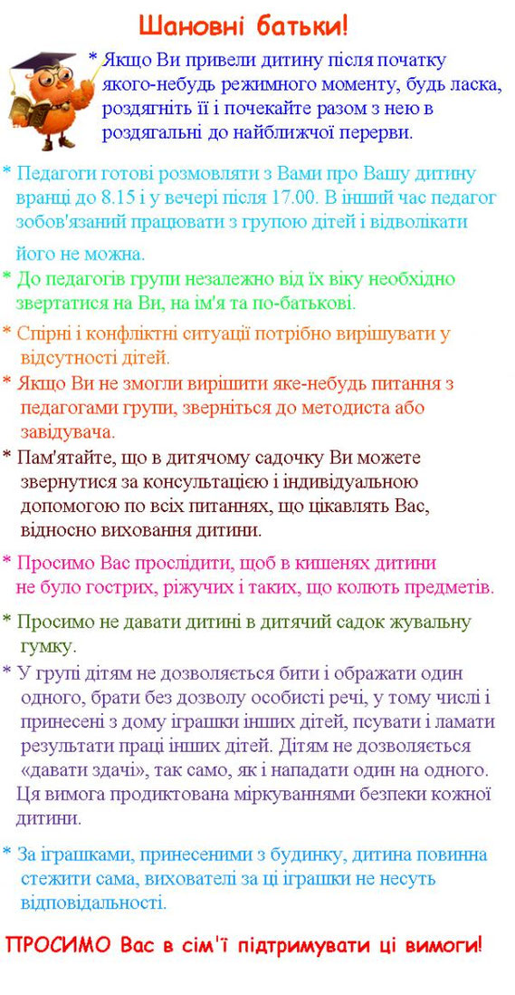 Ми разом з Вами зацікавлені в тому, щоб відвідування дитиною дитячого садка було комфортним і корисним. Тому просимо Вас дотримуватися наступних правил: